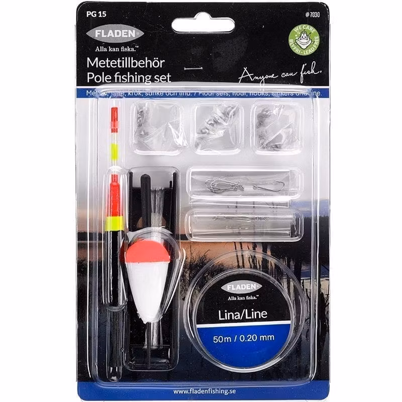 Komplett metetillbehör. Innehåll:• Flöte 40mm• Lina 6m• Krok• Blyfritt sänke.