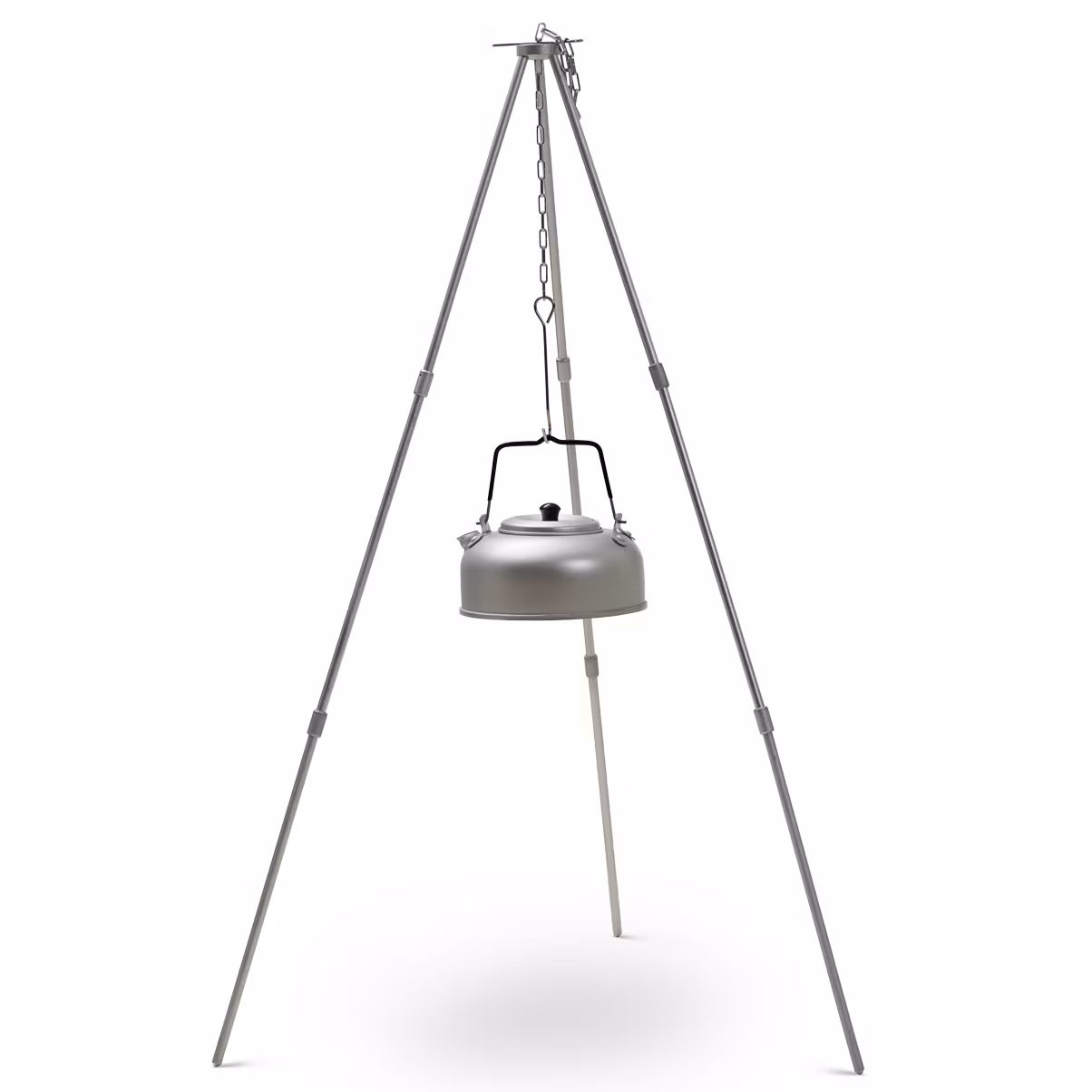Hopfällbart trebensstativ för smidig kokning av kaffe eller vatten över öppen eld. Reglerbar kokhöjd via justering av kedjans längd.