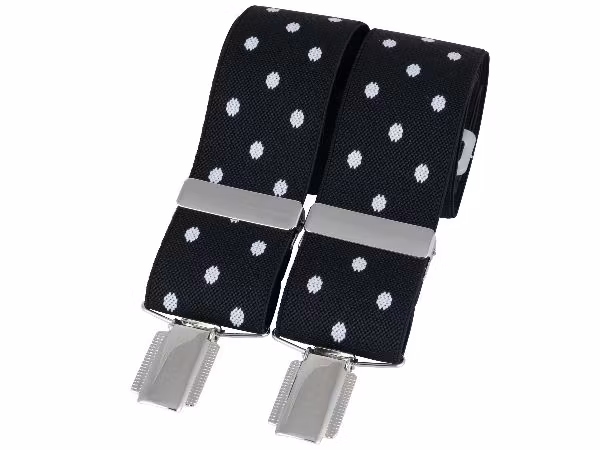 Klassiska svarta hängslen med vita prickar och två silverspännen fram och bak.