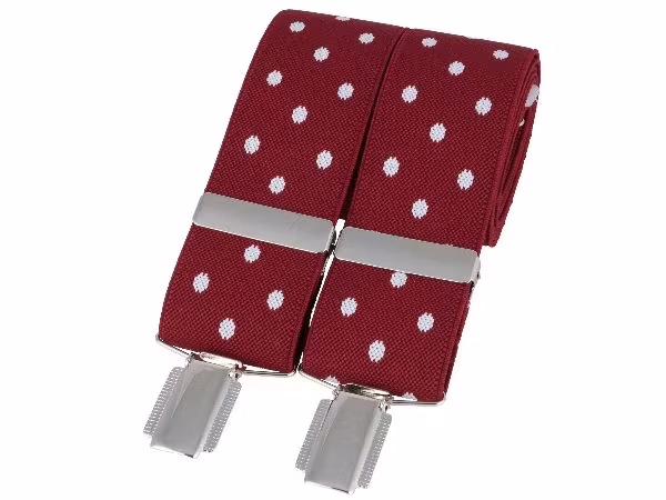Klassiska röda hängslen med vita prickar och två silverspännen fram och bak.