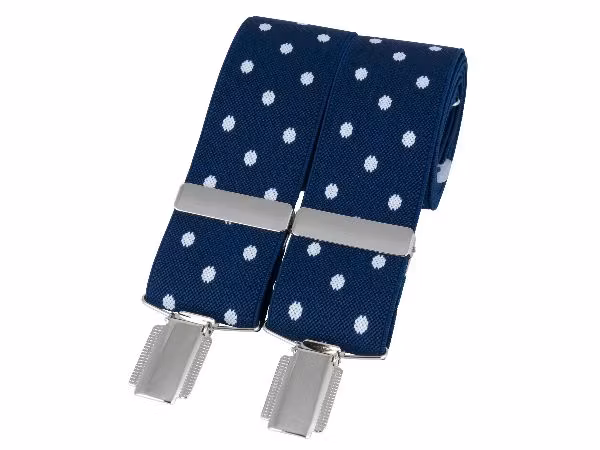 Klassiska blå hängslen med vita prickar och två silverspännen fram och bak.