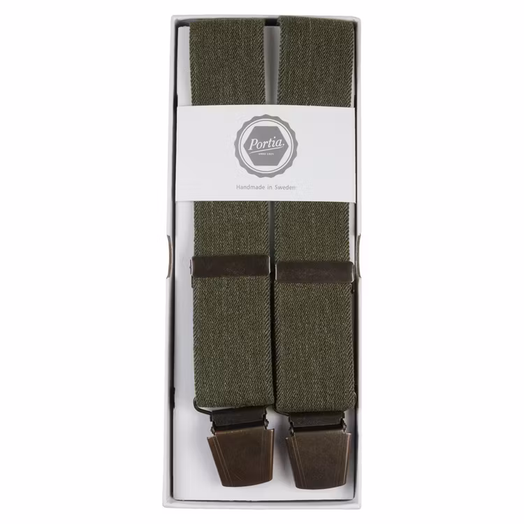 Läckra kvalitetshängslen från Portia med mörka clip-on spännen. Två spännen framtill och två baktill vid ryggen. Levereras i en presentbox. Portia´s hängslen tillverkas förhand i deras fabrik i Malmö.
