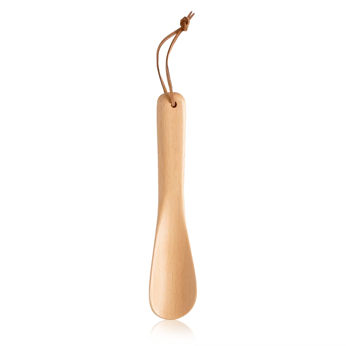 Exklusivt träskohorn i natur. Stilren design med läderband för upphängning. 19 cm lång med läderband.