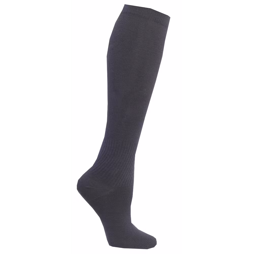En mörkblå, ribbad, stödstrumpa i ull från Zent. Stödstrumpan har graderad kompression (11-14 mm HG) som ger extra energi åt benen.