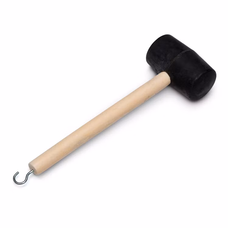 Praktisk gummihammare för att slå ner tältpinnar med. På änden av handtaget finns en krok som kan användas vid uppdragning av tältpinnar. Träskaft med klubbhuvud av gummi.