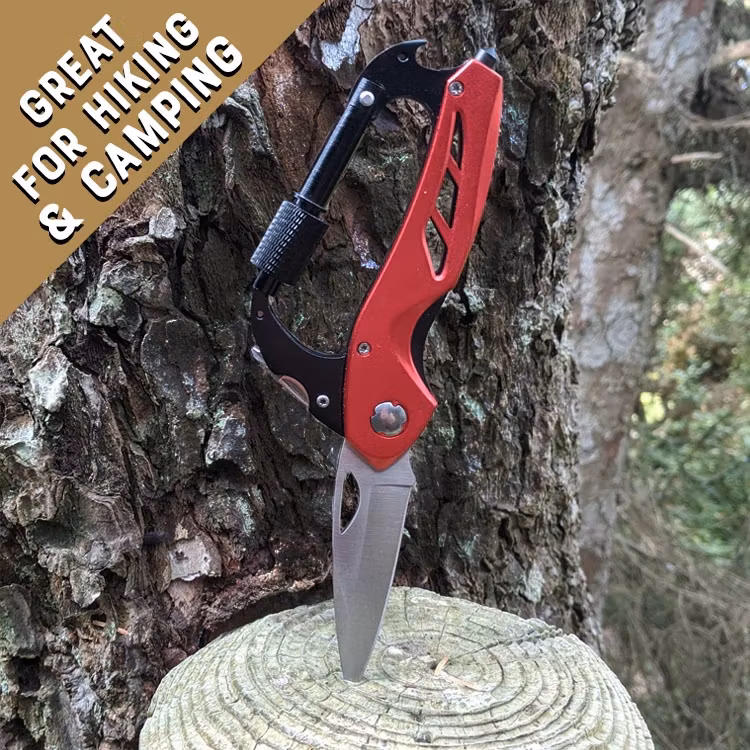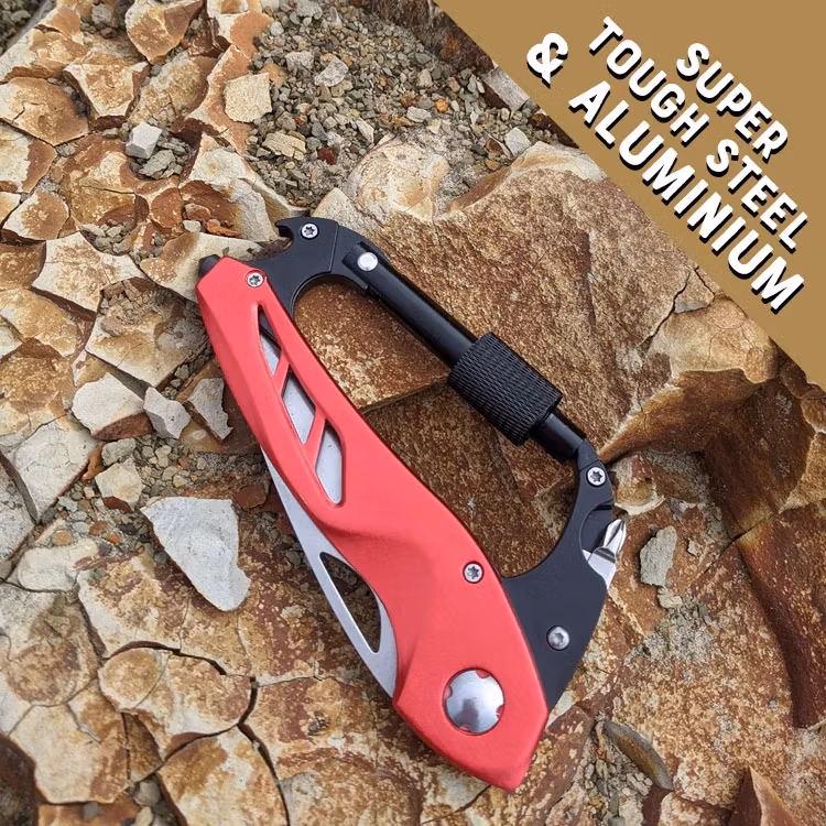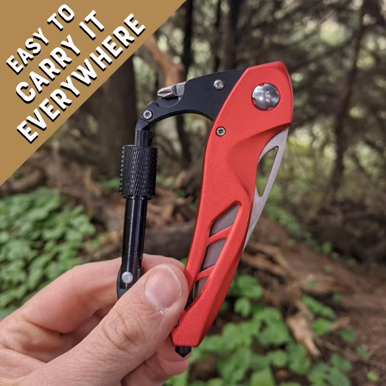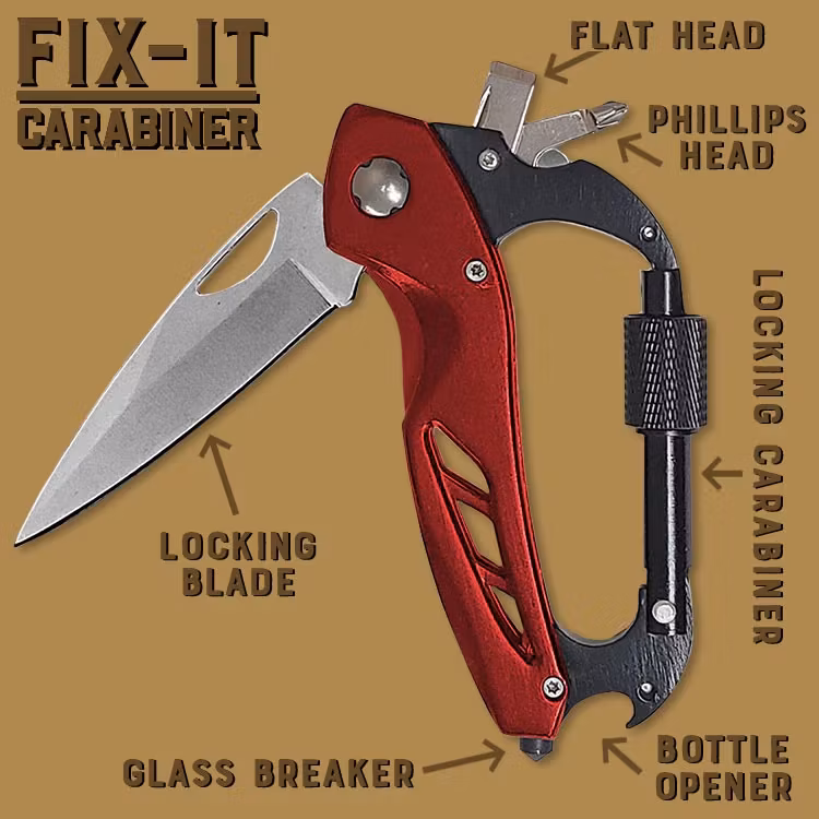 "Fix-It" karbinhake inkluderar: Kniv, låskarbin, stjärnskruvmejsel, platt skruvmejsel, flasköppnare, glaskross, nyckelknippefäste.