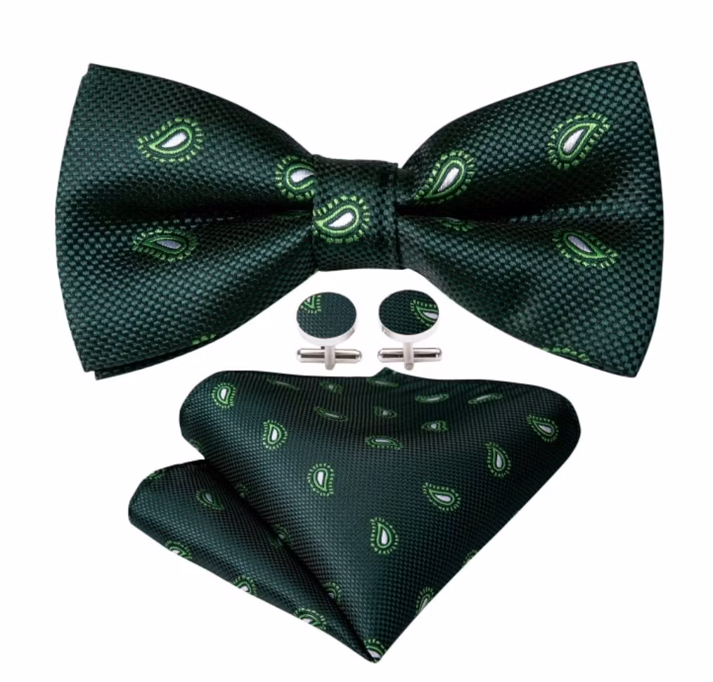 Mörkgrön fluga, manschettknappar, bröstnäsduk