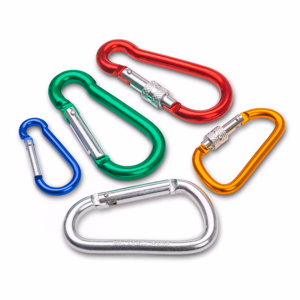 Praktiska karbinhakar (carabiners) i olika storlekar och färger.