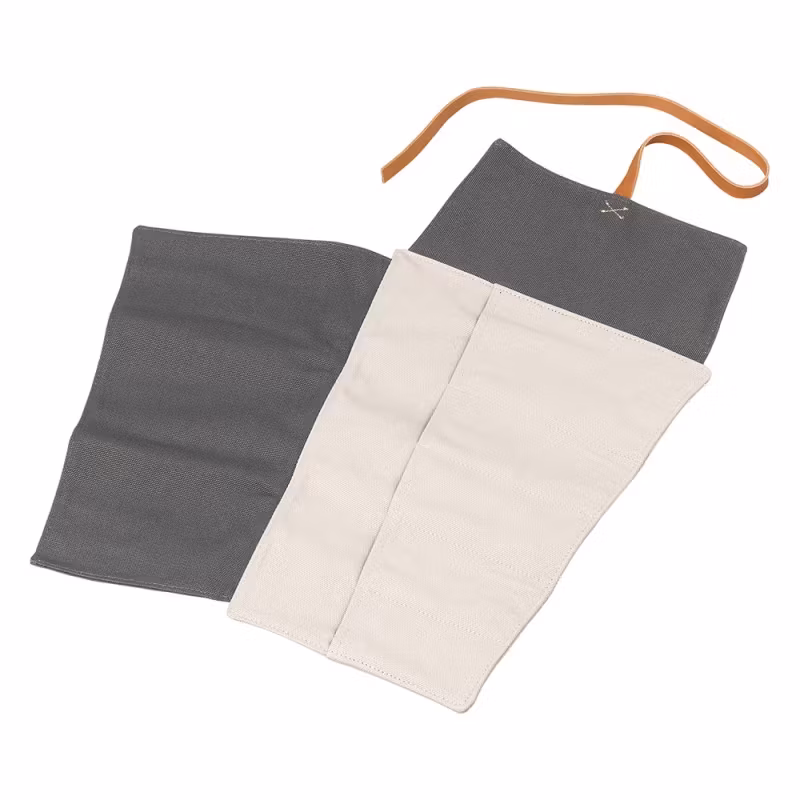 Läcker verktygsrulle i canvas med läderrem för stängning och fem fack med gott om plats.