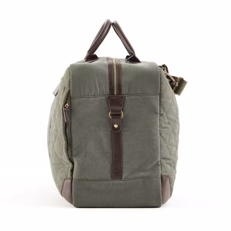 En grön kviltad weekendväska med detaljer i konstläder och ett vackert rutigt innerfoder. Väskan har en avtagbar, reglerbar axelrem, samt dubbla handtag.