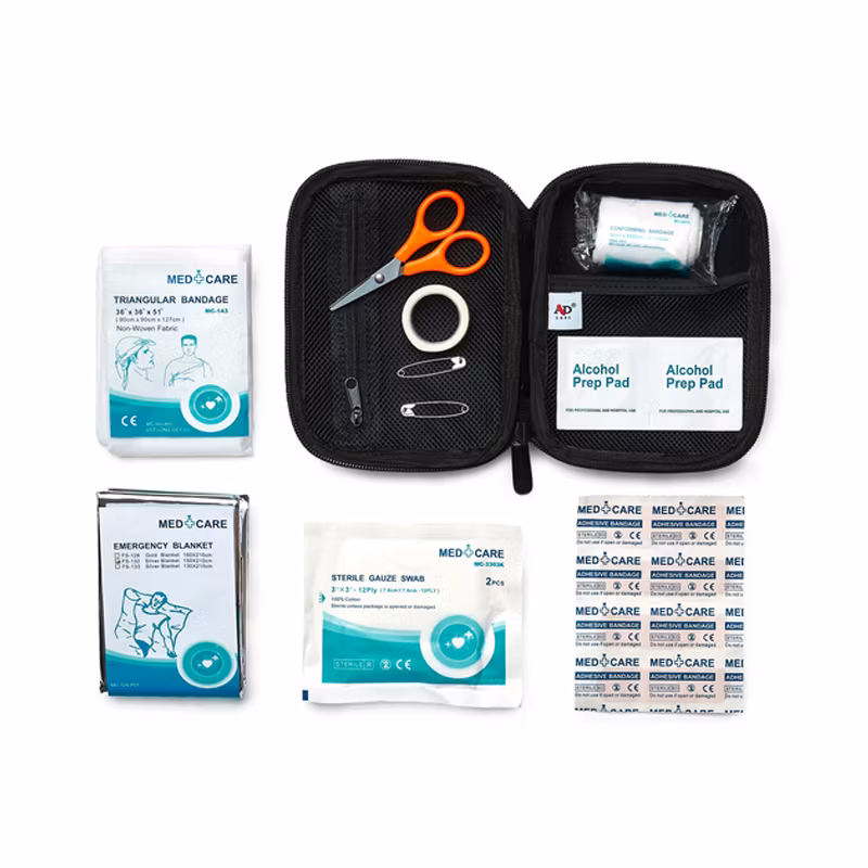 Snygg första hjälpen kit i vit box med präglat kors och svart handtag.