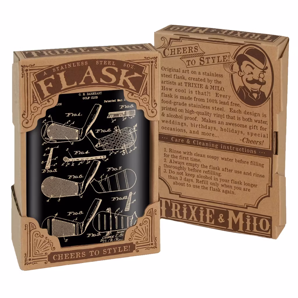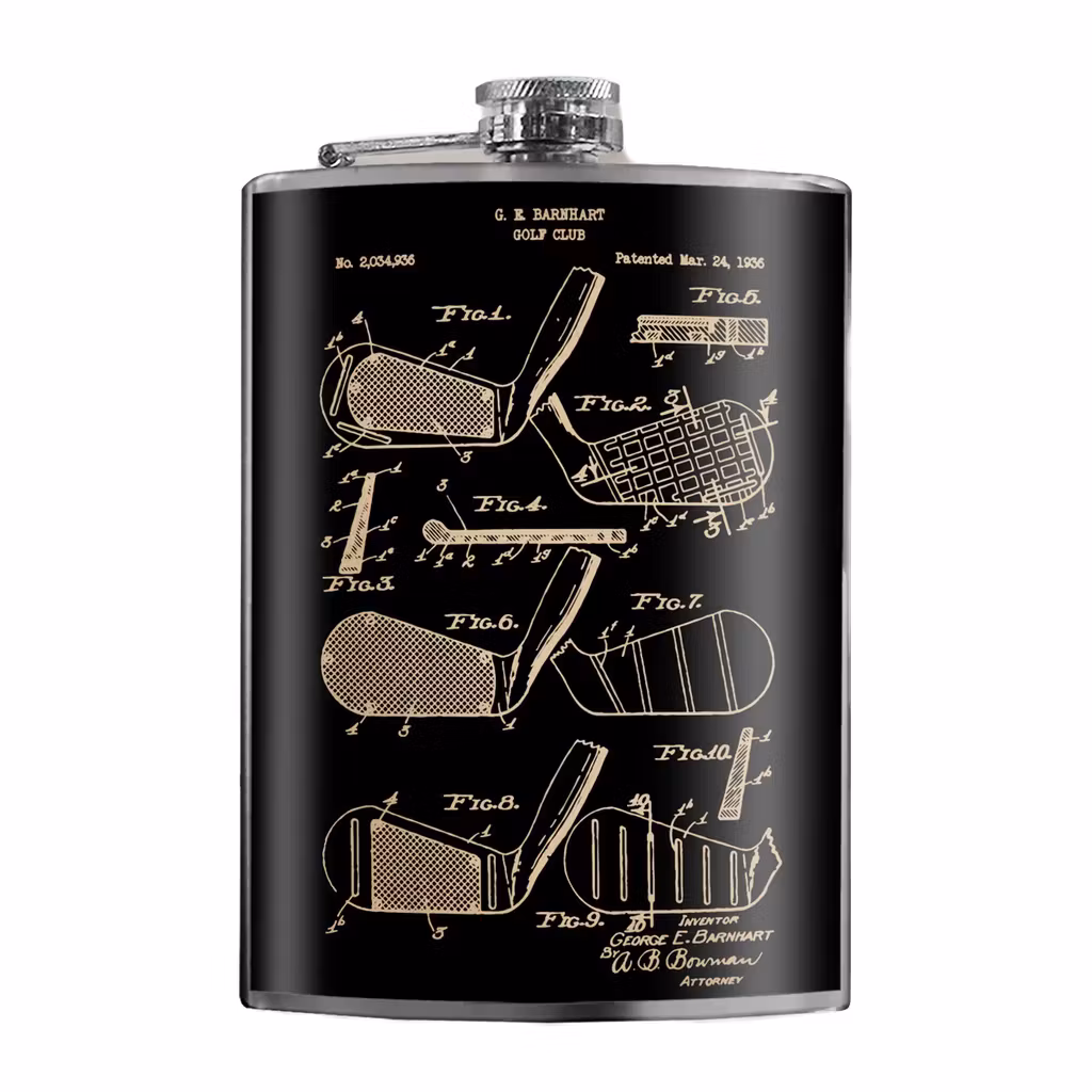 Golf Club Diagram - originalkonst på en fickplunta av rostfritt stål; skapad av artisterna Trixie & Milo - hur coolt är inte det?