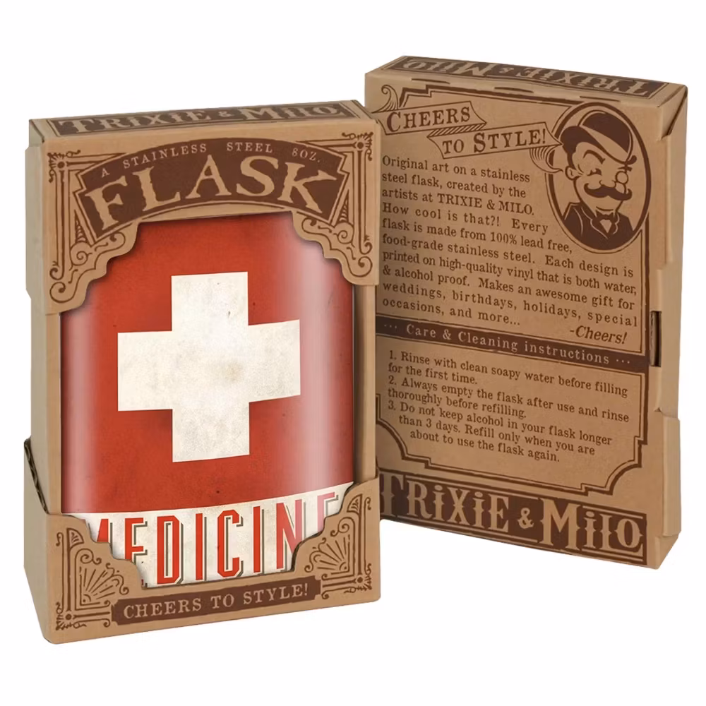 Medicine - originalkonst på en fickplunta av rostfritt stål; skapad av artisterna Trixie & Milo - hur coolt är inte det?