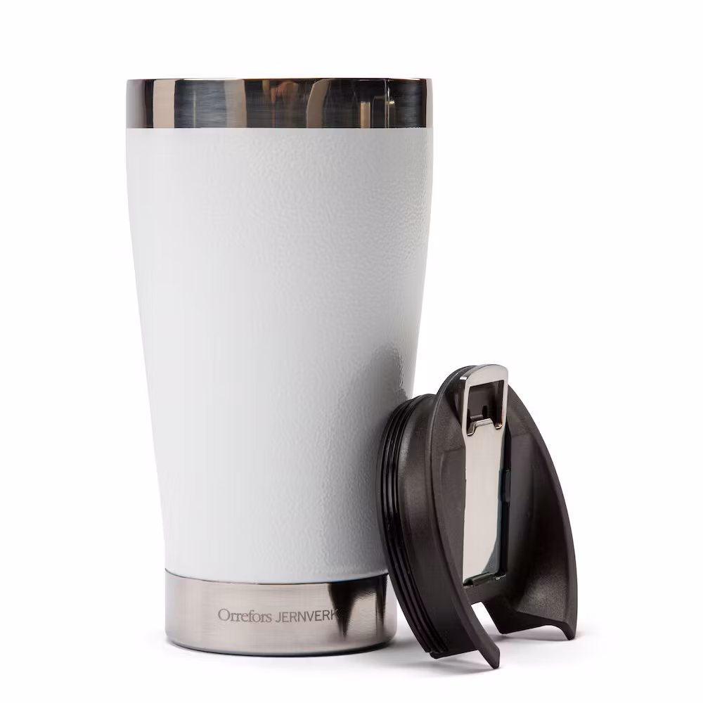 Vit isolerad mugg från Orrefors Jernverk. En vakuumisolerad mugg med dubbelvägg som håller kylan under en längre tid.
