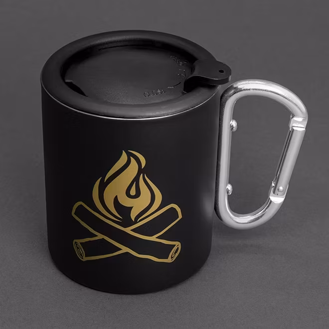 En metallmugg med en karbinhake som handtag! Perfekt att hänga i väskan eller ryggsäcken på nästa äventyr.