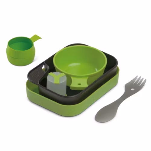 Komplett tallrikslåda innehållande tallrikar, bestick, kryddburk, kåsa, och skärbräda. Allt innehåll får plats i den stora lådan, vilket gör att tallrikslådan är lätt att ha med sig i packningen. För utflykt, camping, vandring och hiking.